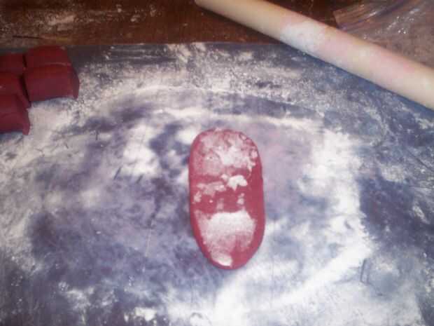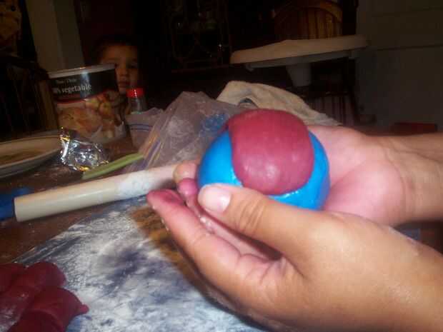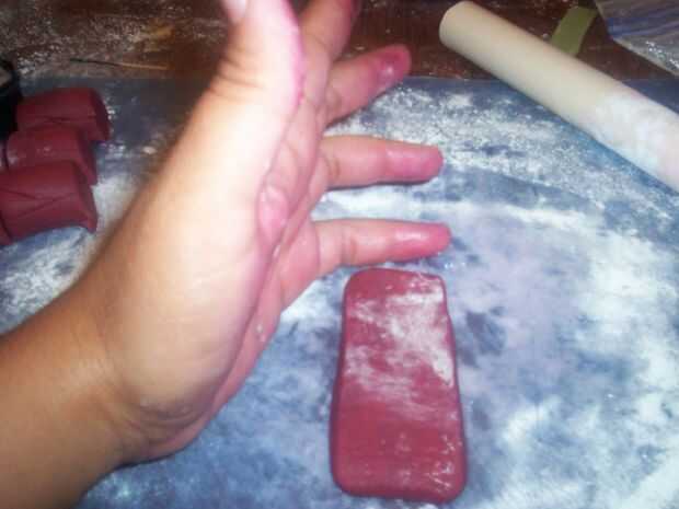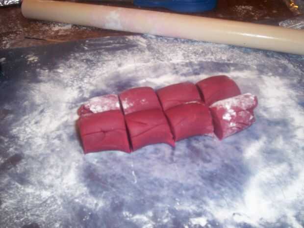 ahora necesita tu fondant violeta rojizo (alrededor de 4,5 oz) cortada en 8 pedazos rodar hacia fuera así que lo más amplia y forma con las manos poner en la bola de plasma y liso en Repita para los otros