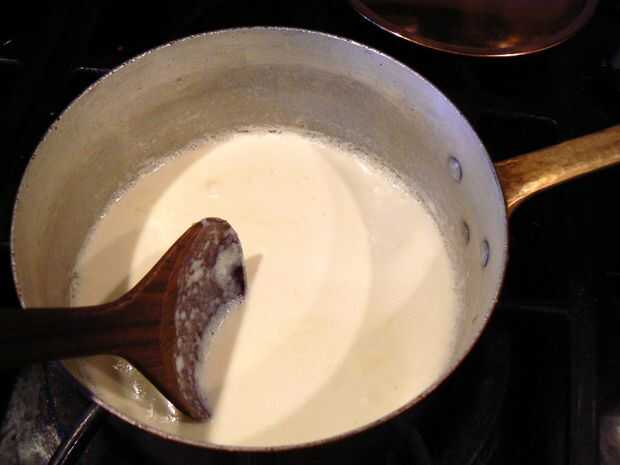 En una olla mediana, calentar la crema de leche y la leche hasta que hierve a fuego lento