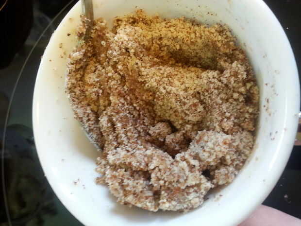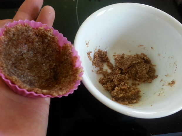 Almendras de pulso en el procesador de alimentos hasta que queden trozos pequeños, con la textura deseada (me gusta un medio molido para su textura de la corteza). Dependiendo del tamaño de su plato, combinar harina de almendra con pasta de fecha, para que la mezcla es un poco grumosa, pero puede pegarse al presionar. Presione la corteza en moldes individuales o tartera.