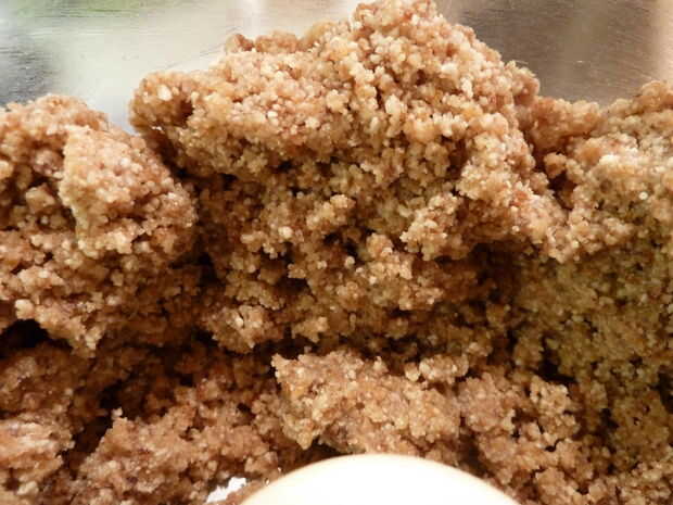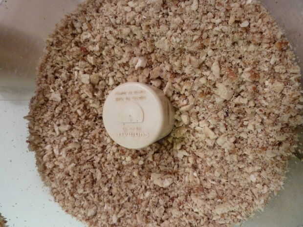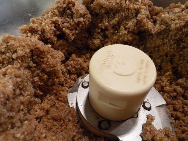 5. molienda, poco a poco añadir los frutos secos a la mezcla de nueces y seguir moliendo hasta que te quedan con un acabado suave donde la tarta desmenuzable se mantiene unida por la viscosidad en los frutos.