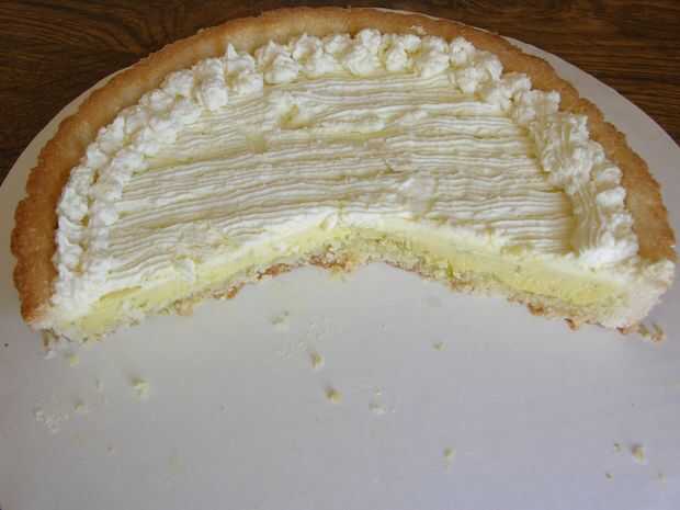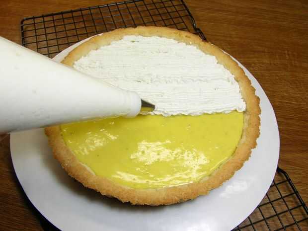 Coloque extremo crema a una manga pastelera grande, doblar la tapa encima y crema batida de transferencia para la Manga pastelera, abrir el plegamiento y tuerza la parte superior extra, cubrir la parte superior de la tarta con crema de yendo y viniendo y círculos de punto a lo largo de la orilla si hay crema todavía.