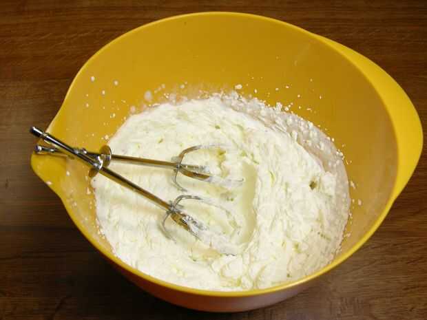 Batir crema de leche con batidora de mano al pico suave siguiendo las instrucciones de su mezclador.