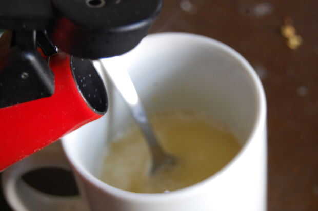 Poco a poco verter agua hirviendo sobre la mezcla, sin dejar de batir con un tenedor. Vierta suficiente agua para llenar su taza. Si te gusta su bebida al vapor caliente, zap en el microondas durante unos segundos.