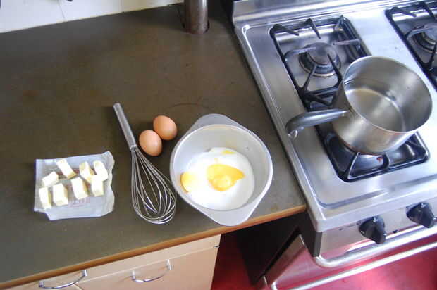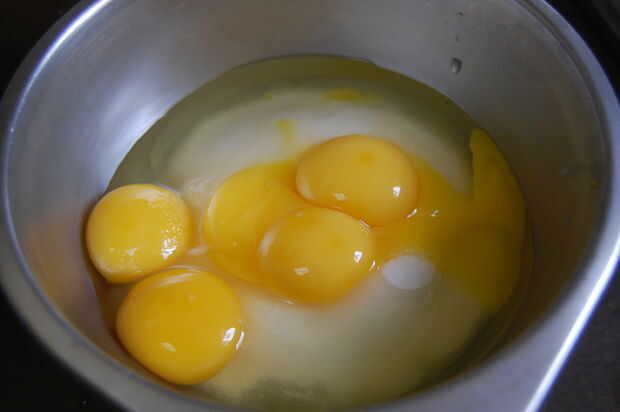Combinar los huevos, las yemas de huevo y el azúcar en baño María.