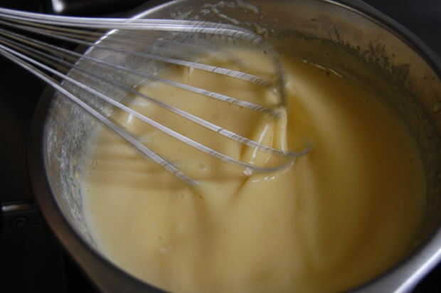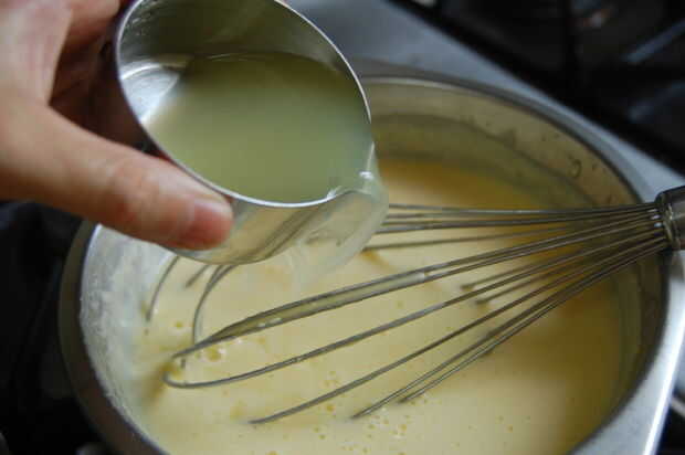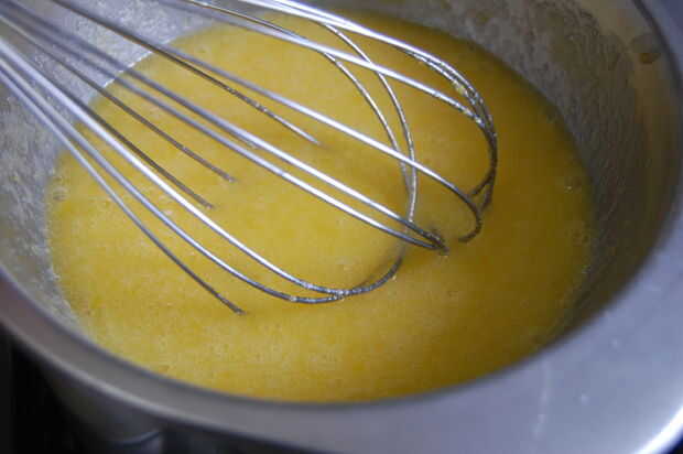 Bate y ver la mezcla de transformación. Comenzará brillante amarillas y granuladas. Medida que el azúcar se derrite es más líquido, más pálida y espumosa en la parte superior. Después de unos 8 a 10 minutos espese y se convierten en limón pálido de color.