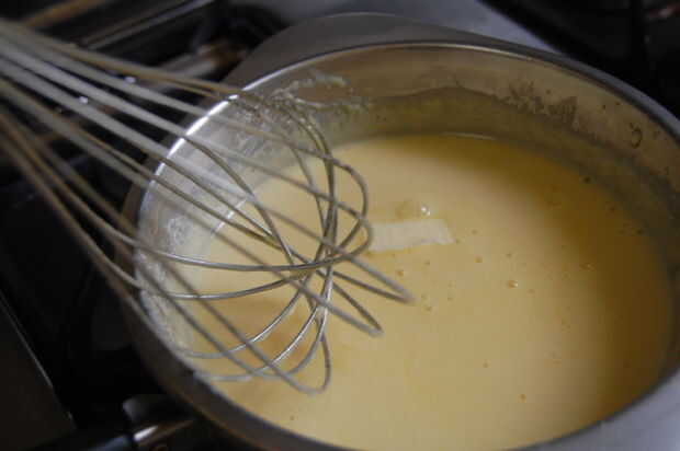 Agregue la mantequilla, una pieza a la vez, dejando que cada pieza se derrita antes de añadir el siguiente.