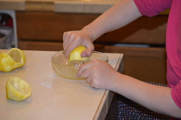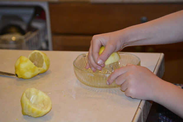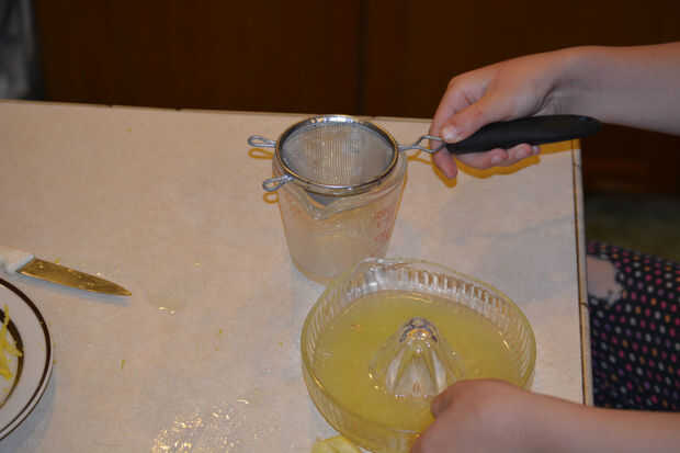 Después de que los limones han sido ralladura, hacerlas rodar sobre el mostrador. Luego cortar por la mitad y exprimir el jugo de ellos. Rodar los limones en el mostrador ayuda a liberar el jugo de los limones. Jugo de los 2 limones restantes así. Deberás acabar con casi 1 taza de jugo de limón. Asegúrese de escurrir el jugo de limón para que queden semillas ni pulpa en el jugo.