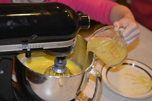 Con la batidora funcionando, agregue ralladura y jugo de limón a la mezcla de relleno. Una vez que se combinan todos los ingredientes, apagar la batidora y raspar hacia abajo los lados para asegurar que todos los ingredientes se han incorporado plenamente.