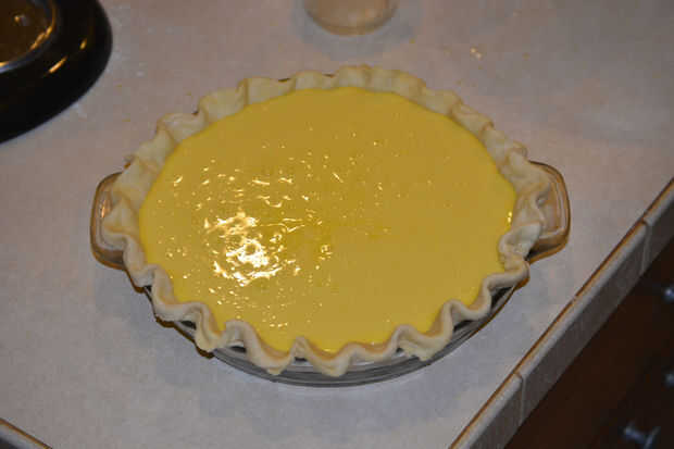 Saque la tarta del refrigerador. Suavemente Vierta el relleno en la tarta y coloque el pastel en el horno. Hornear durante 50 minutos a 1 hora. El pastel debe ser firme en el centro cuando se hace.
