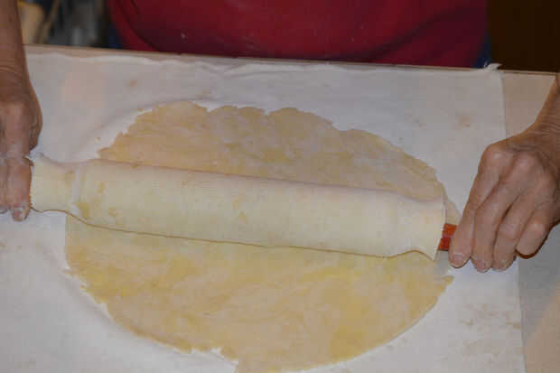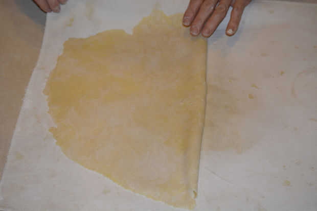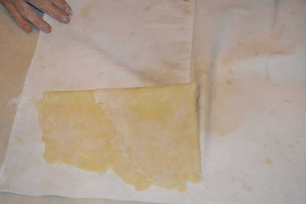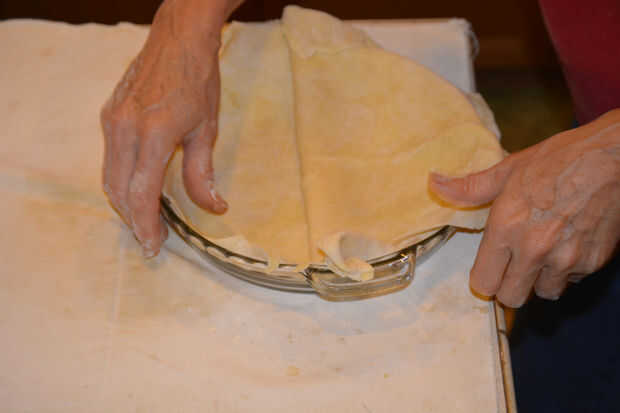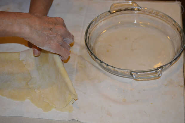 Una vez la masa ha sido lanzada, cuidadosamente doblar la masa en cuartos, levantar y colocar en la tartera. Alternativamente, usted podría suavemente la masa en el rodillo del rodillo después desenrollar en la tartera.