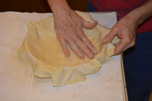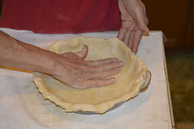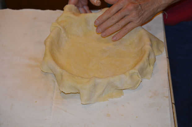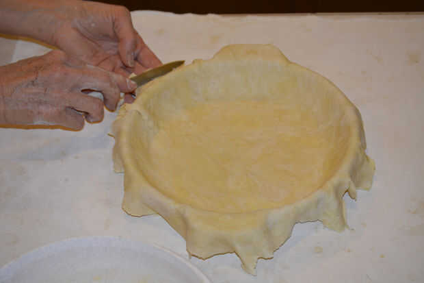 Suavemente forman la corteza de pastel a caben en la sartén, levantar y ajustar según sea necesario. Una vez colocado la tarta en la tartera, recortar el borde sobrante de la corteza por lo cerca de 1 pulgada de corteza sobresale por el borde de la placa.