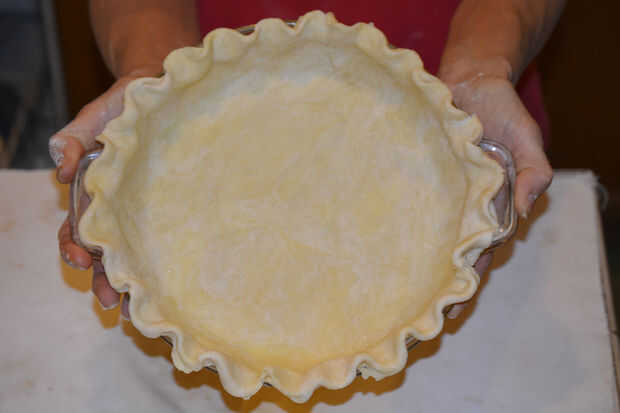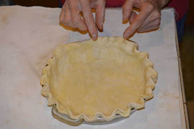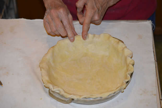 Doblar suavemente la corteza extra debajo del borde de la placa de la vuelta. Entonces "flauta" del borde de la corteza pellizcando la masa con los dedos índice y pulgar. Mantenga el pulgar en el borde de la corteza mientras pellizcos a cada lado de él con ambos dedos índice. Repita todo el camino alrededor de la placa; Esto resultará en un borde estriado para su pie. Refrigere la corteza haciendo el relleno.