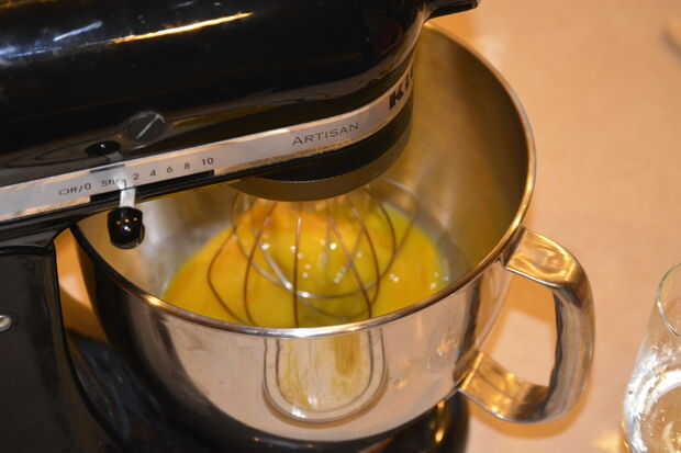 En una batidora con el accesorio batidor, comenzar por batir los huevos. (Una batidora de mano o un batidor grande puede utilizarse así.) Mantenga la mezcladora funcionando mientras que agrega cada uno de los siguiente ingredientes para mantener suave la mezcla.