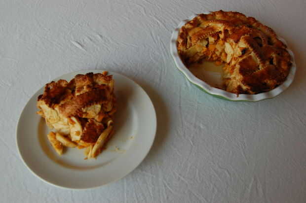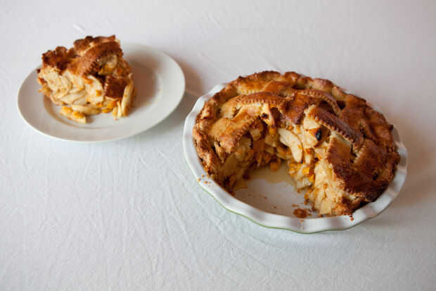 Tarta de manzana caramelo de Bourbon con corteza grasa tocino prestados