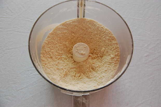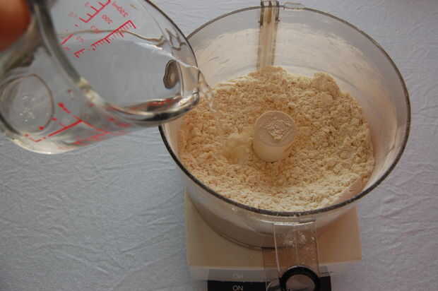 Agregar 1/2 taza de agua fría aproximadamente 1/3 en un pulso de tiempo entre 1/3.  Usted debe poder pellizcar la masa entre los dedos y se pegará.