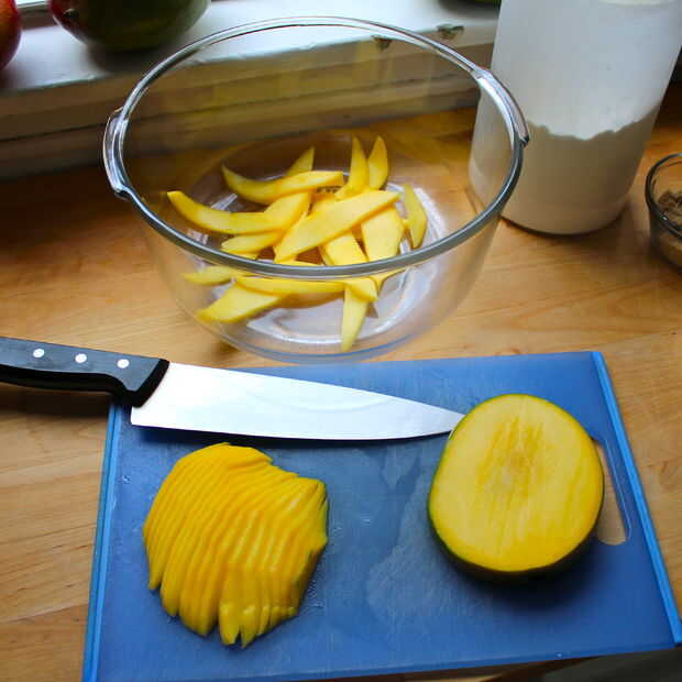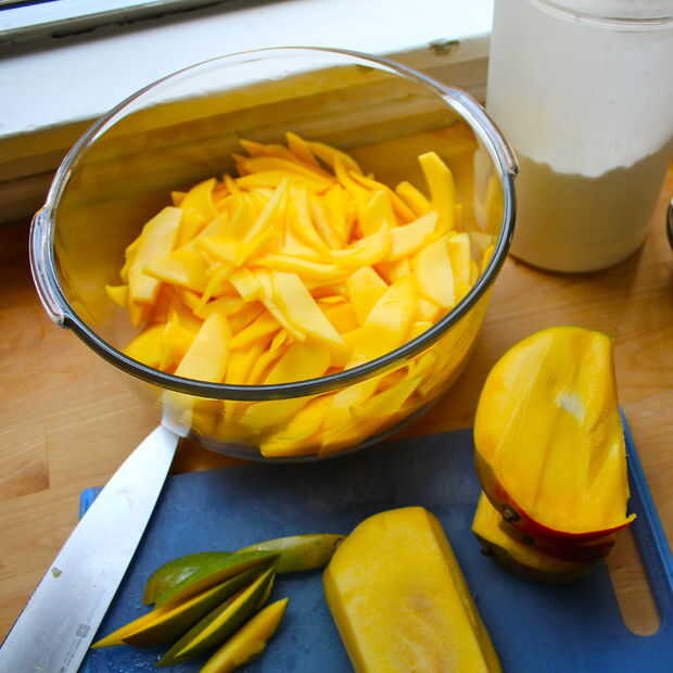 Mi hijo mayor le gusta Mangos y otras frutas tropicales, después de una visita de mi hijo tuve algunos Mangos y caqui frutas sobrantes y no tenía recetas para estas frutas. Así que decidí inventar mi propio.No tengo recetas para tartas de Mango o tar