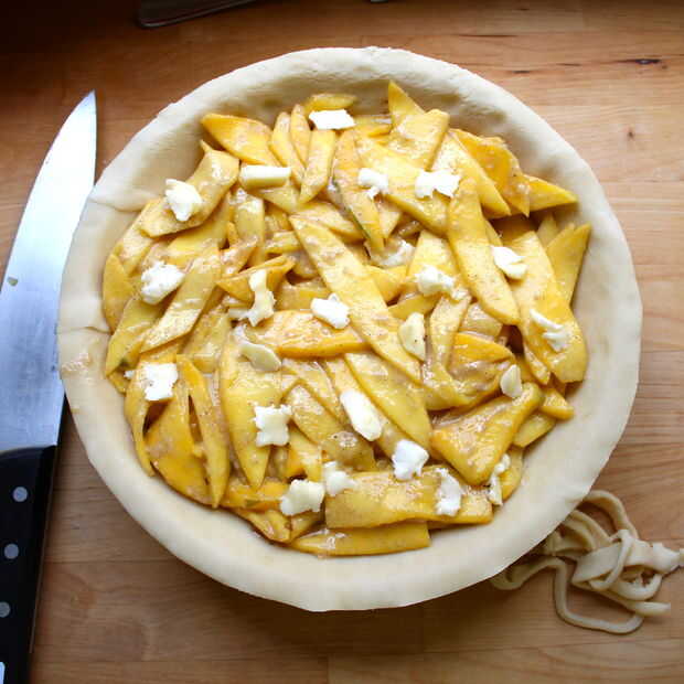 Una vez hecho esto, poner una capa de mangos y punto con mantequilla. Entonces los mangos más y más mantequilla. Seguir haciendo esto hasta que estés fuera de los mangos. : D