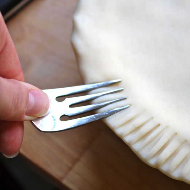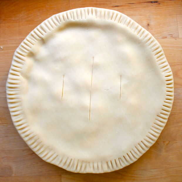 Lugar la corteza superior de la tarta. Pliegue el exceso corteza superior debajo del borde de la corteza inferior. Presione los bordes de la corteza terrestre en su lugar sin embargo te gusta - prefiero el método tenedor perezoso. : D