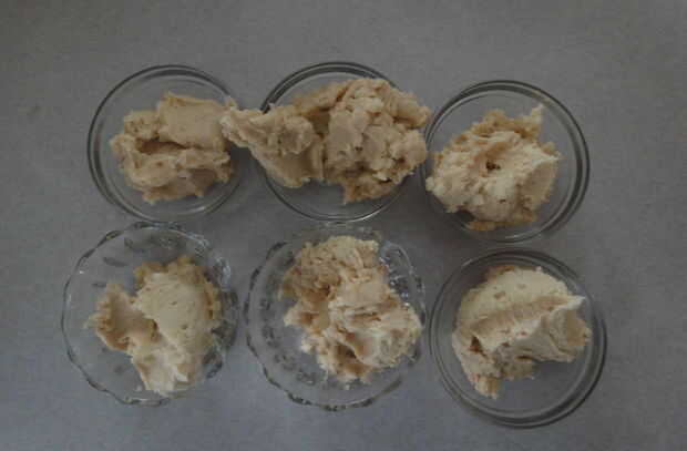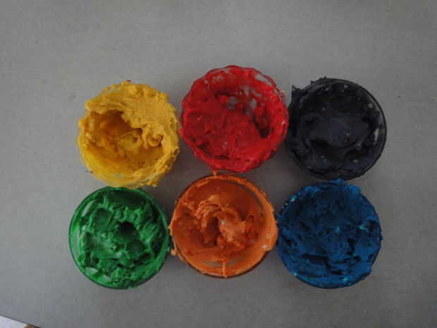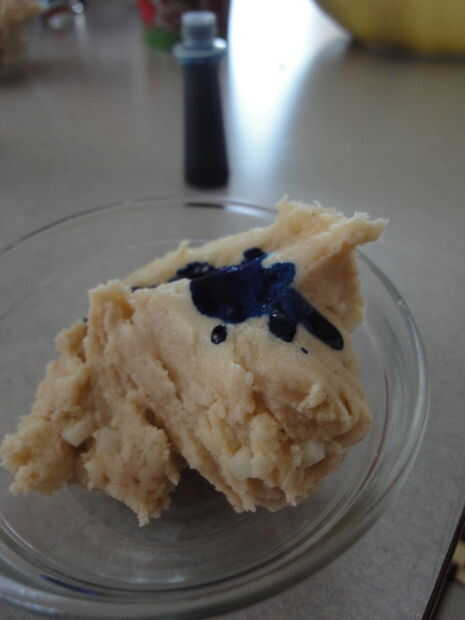 Dividir la masa en aproximadamente 6 partes iguales, con un poco más en uno (para la hoja verde adicional). Teñir las seis partes a sus respectivos colores: