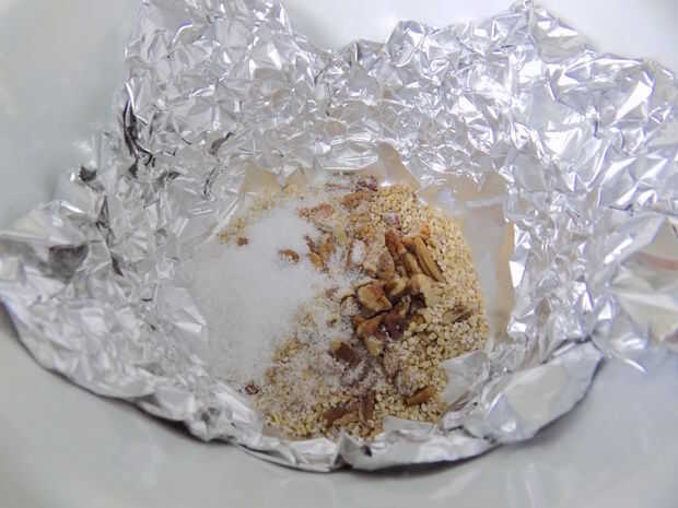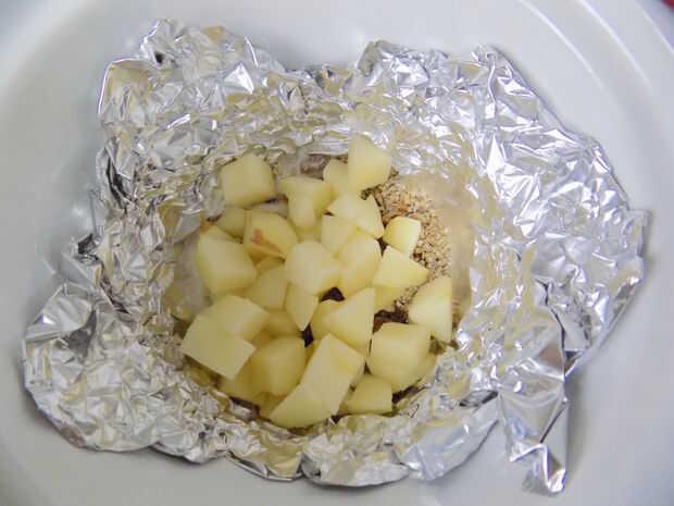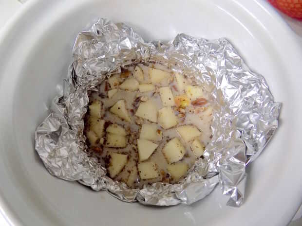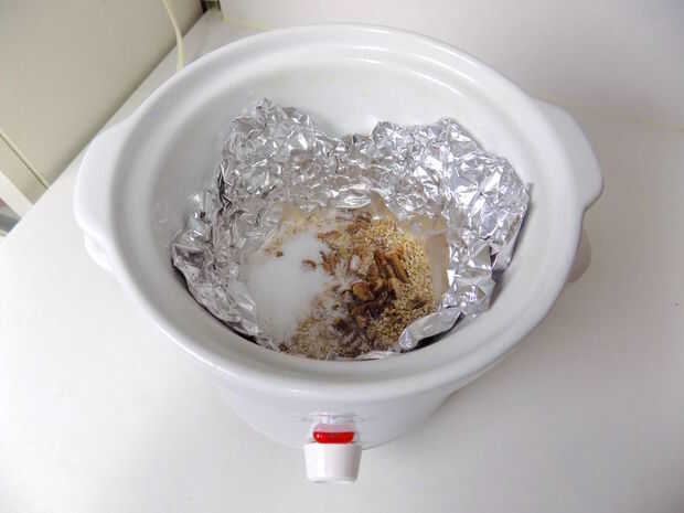 Desplegar un paquete de materiales secos y coloque en la olla. Añadir la manzana y los siguientes ingredientes.