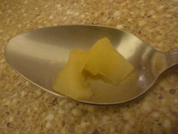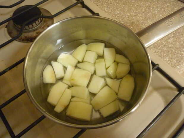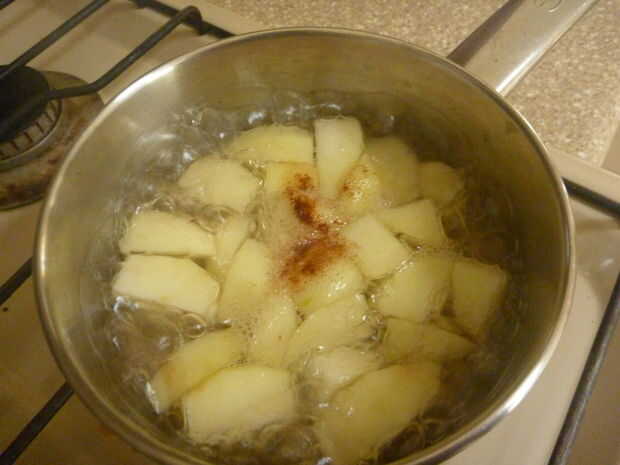 Una vez que usted piensa que los pedazos de manzana están listos, uno saque con una cuchara, permita que se enfríe durante unos segundos, luego lo empujar suavemente con el dedo. Si se rompe fácilmente bajo su dedo, entonces estás listo para el siguiente paso. Si no, dar la manzana unos minutos más en la olla y vuelva a intentarlo.