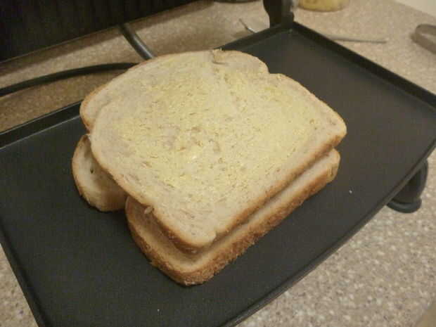 Una vez hecho esto, coge el pan y la mantequilla (muy ligeramente) ambos segmentos, sólo para asegurarse de que no se peguen en el interior del grill-sandwichera.