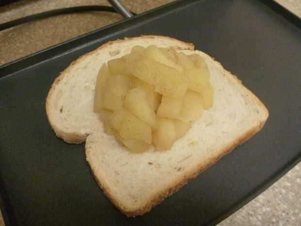 Así que por ahora el grill-sandwichera debe ser listo, lo primero que tienes que hacer aquí es colocar uno de tus rebanadas de pan (enmantequillada por el lado hacia abajo) en la parrilla y pop tus trozos de manzana en el centro de la rodaja. Si lo desea, puede poner un poco de extra canela en polvo y azúcar en tu apple ahora así, pero realmente no creo que sea necesario.