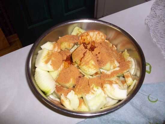 A las manzanas en rodajas, añadir 1 cucharadita de canela, 1 cucharadita de vainilla y 1/2 cucharadita de nuez moscada molida moscada. (Mezclar estos ingredientes en las manzanas colocando un segundo cuenco encima de la primera de ellas y sacudiendo el lío todo.)