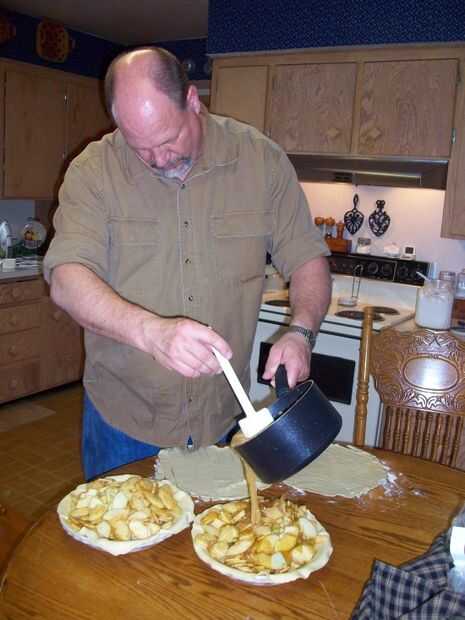 Vierta la mitad de la salsa de caramelo sobre las manzanas en la tartera. Guarde la otra mitad!
