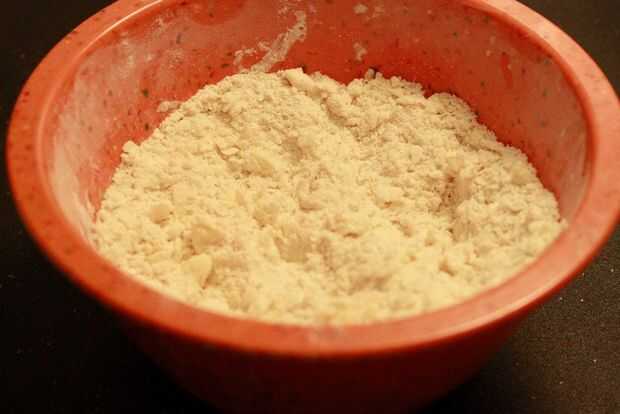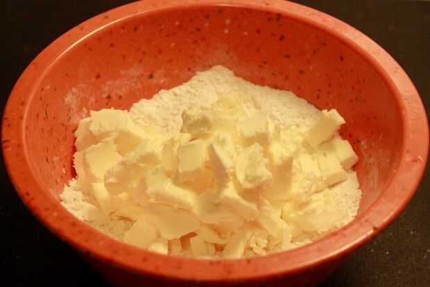 En un tazón mediano, mezcle la harina, el azúcar y la sal hasta combinar. Luego cortar la mantequilla en cubos pequeños y ponerlos en el recipiente. Si tienes un cortador de pastelería, ahora es el momento de arrastrar fuera de su cajón y polvo. No tengo suerte de tener uno, así que cogí el tenedor más grande que pude encontrar. Usé esta horquilla cómicamente gigante para disolver la mantequilla en la mezcla de harina hasta que se mezcló bastante bien.