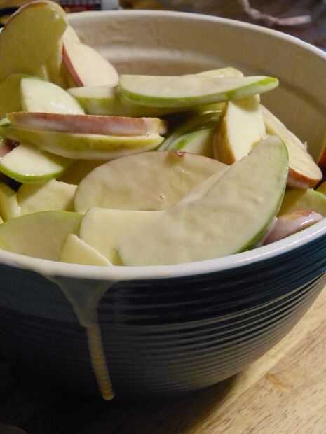 • Añadir las manzanas y mezcle hasta que las manzanas están cubiertas en la mezcla de crema agria