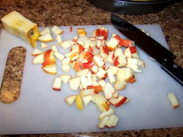 Ahora, vierta en la cacerola enmantecada. Ahora toma tu manzana y picar para arriba.  Sí, he dejado la piel en. Es una sabrosa y nutritiva parte de la manzana así que aceptarlo! Añadir las manzanas a la sartén y espolvorearlos alrededor. Espolvorear sobre la canela. Por mucho que desee. Se hará una polvoreda ligera. Azúcar marrón del gancho agarrador y espolvorear en la parte superior. Ahora la descarga en el 1/4 taza de mantequilla (derretida). NO MEZCLE!!!