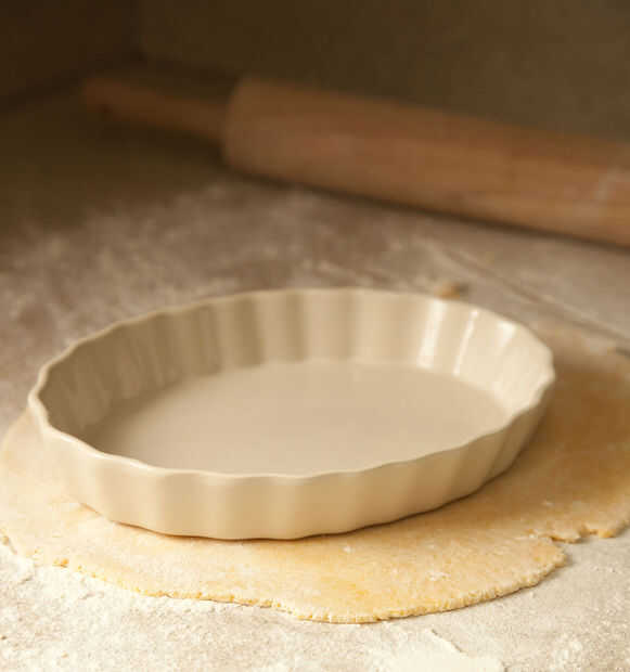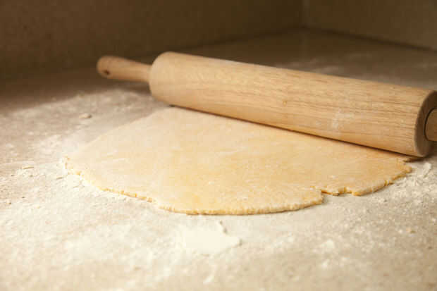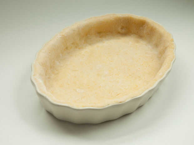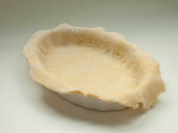 De sacar el disco de la nevera y se deja reposar en el mostrador durante 15 minutos. Espolvoree una encimera limpia ligeramente con harina y rodillo la masa a sobre 1/4 de pulgada de espesor. Colocar la tartera encima de la masa para asegurarse de que es lo suficientemente grande como para forrar el fondo y los lados de la cacerola. Rodillo la masa en el palote y la transferencia sobre la tartera. Desenrolle y presione suavemente la corteza en el fondo y los lados de la cacerola de la empanada. Rodar el rodillo por encima de la bandeja para recortar exceso corteza.