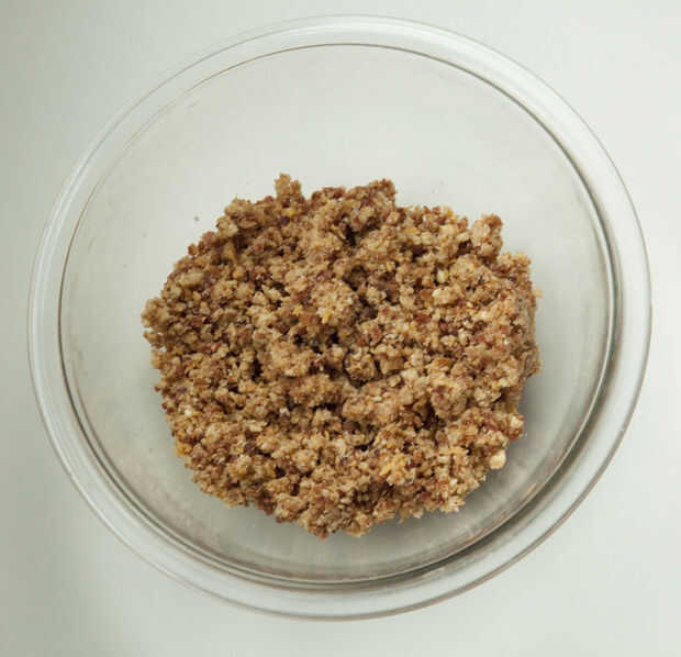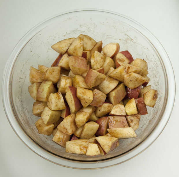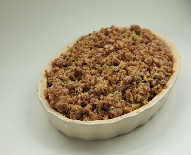 Combinar ingredientes de relleno en un tazón hasta que las piezas de apple están bien cubiertas. Lugar se desmoronan los ingredientes en un procesador de alimentos y pique hasta que se convierte en migas gruesas. Verter el relleno de manzana en tarta. Espolvorear crumble mezcla de tocino sobre la parte superior del pastel.