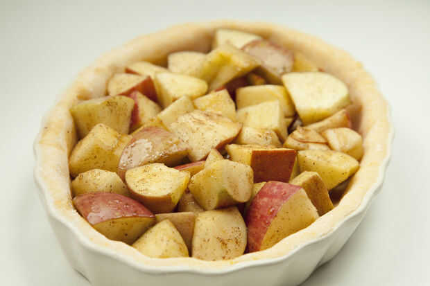 esto es un giro en una tradicional tarta de manzana. En lugar del relleno que consiste en círculos de rebanada finamente, las manzanas tienen forma para asemejarse a pi. (Engañar esta vez teniendo la base picada manzana y luego la capa superior está