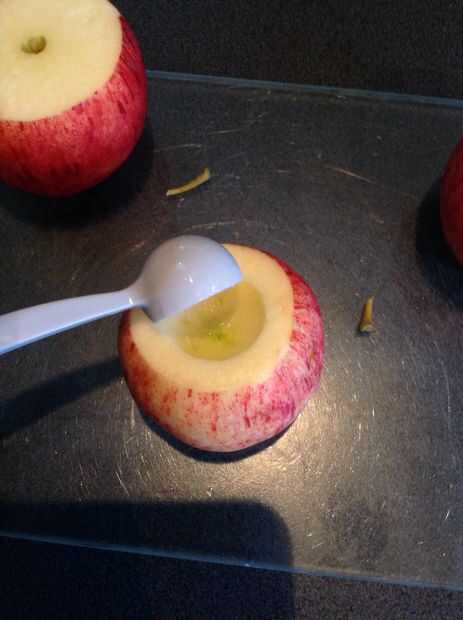 Utilizar a un melón para ahuecar el centro de la manzana. Yo tiro todos los bits con pepitas en el compost, pero las otras piezas con pala hacia fuera, coloque en una olla. Usé al melón que llegué de una fiesta de Tupperware para traer a un amigo... Aunque hay probablemente mucho más fácil manera de conseguir uno. En su defecto, una cuchara pequeña funciona bien.