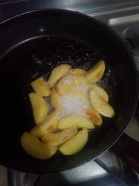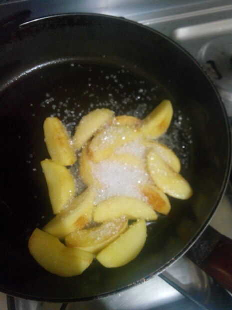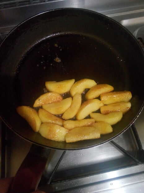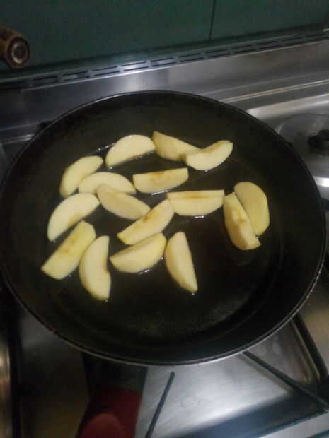 En una sartén antiadherente, calentar ligeramente 2 cucharadas de mantequilla, añadir las manzanas, lanzarlas alrededor un poco y dejar cocer a fuego medio durante unos 5 minutos. Añadir 3 cdas azúcar de caña, mezclar delicadamente y dejar cocinar hasta que el caramelo