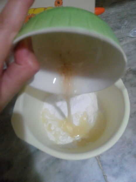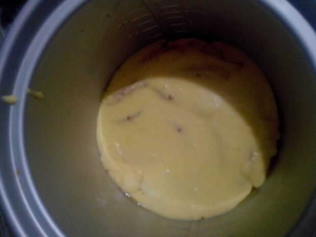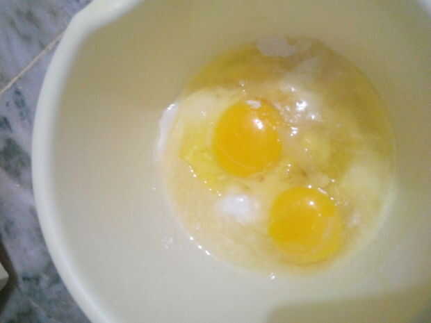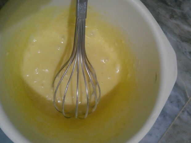 y luego de harina 70g (1/2 taza) con 50g (1/4) taza granulado de azúcar, 1 cucharadita de polvo de hornear, una pizca de sal, 3 cdas derrita mantequilla y dos huevos, mezclar bien y verter esta mezcla sobre las manzanas, cubriéndolas totalmente. Encienda la tarta y cocinar.