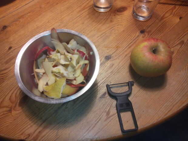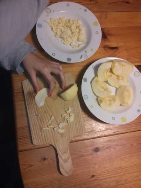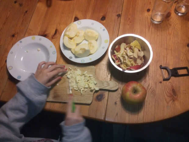 Mientras tanto mi novia había pelada y cortada dos de las manzanas en trozos pequeños, la tercera en cuartos.