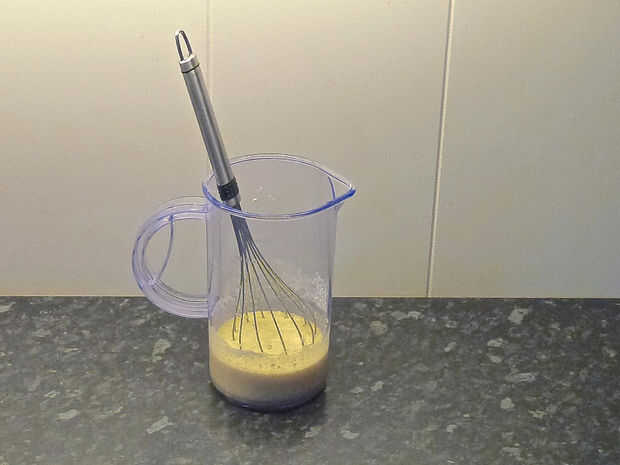 En un recipiente aparte, añadir el huevo, leche, esencia de vainilla, 1 cucharada de mantequilla, 1/4 taza de harina para todo uso, 5/8 taza de azúcar, 1/4 cucharadita polvo de hornear, 1/8 cucharadita de sal. Batir. Vierta sobre las manzanas.