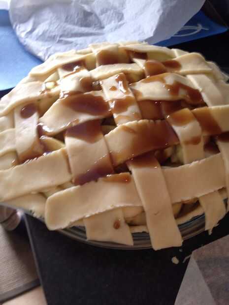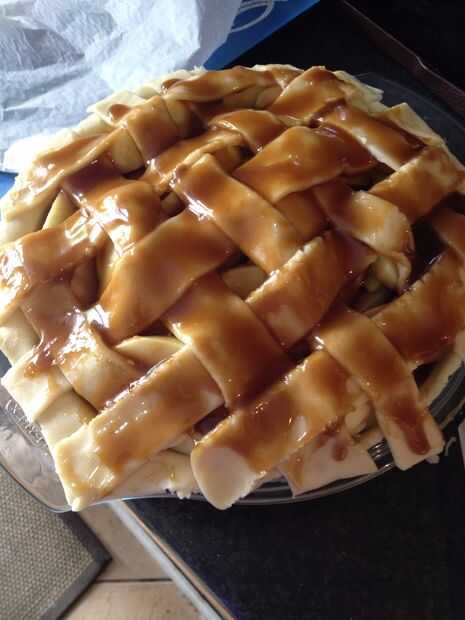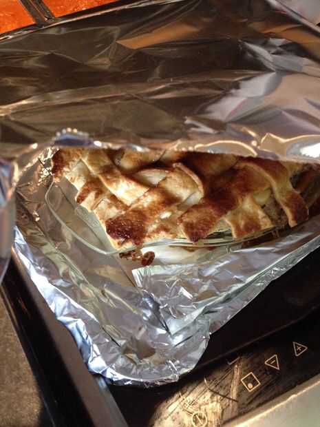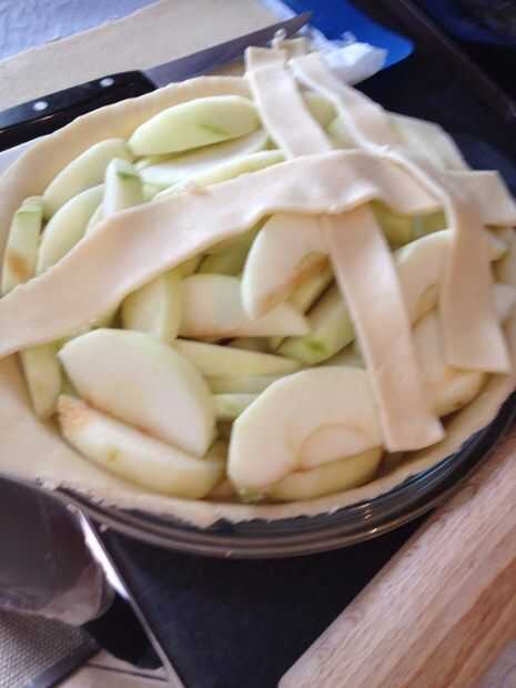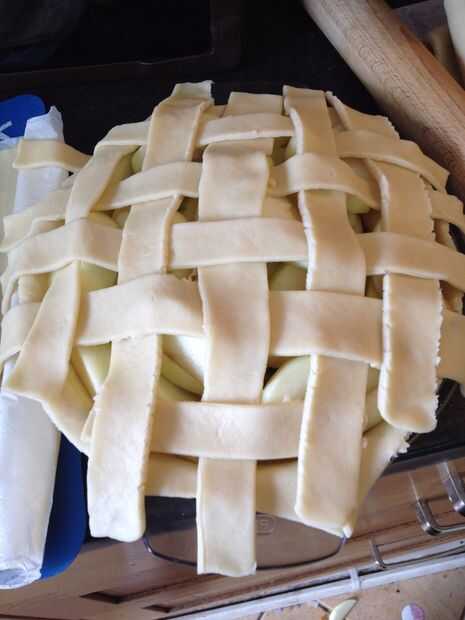 Tejer las tiras de masa sobre la parte superior del pastel como se muestra en las fotos.