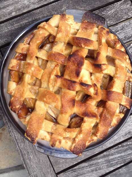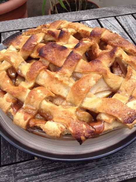 esto es un giro en una tradicional tarta de manzana. En lugar del relleno que consiste en círculos de rebanada finamente, las manzanas tienen forma para asemejarse a pi. (Engañar esta vez teniendo la base picada manzana y luego la capa superior está
