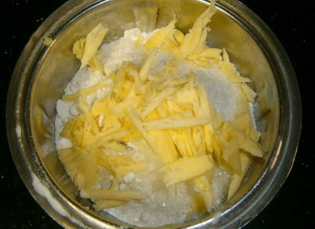 En una batidora/licuadora reunir todos harina, manteca fría, sal y azúcar. Lo del pulso o combinar hasta forma una textura grumosa.