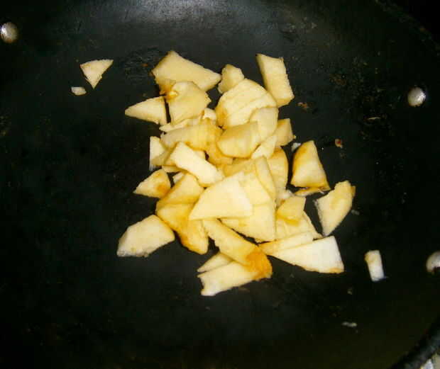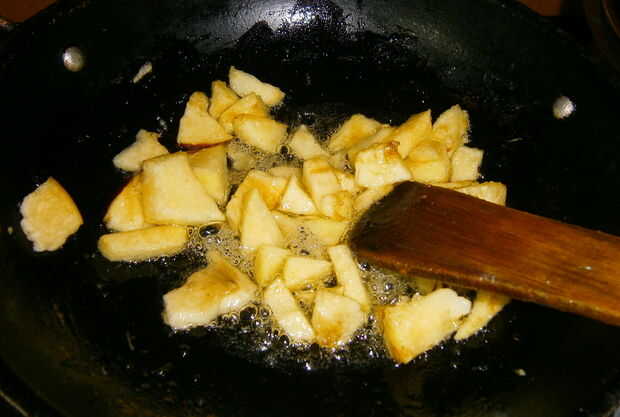 Añadir las manzanas y el azúcar. Dejar que la caramalize de apple y dar vuelta a marrón.