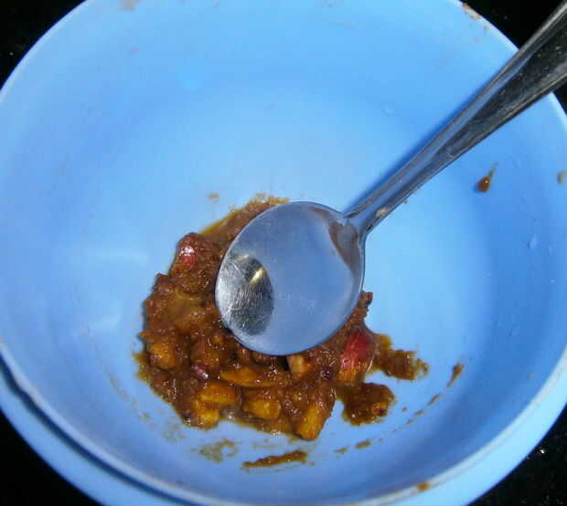 Ahora transfiéralo a un recipiente. Con la ayuda de una cuchara o un tenedor les puré para que se conviertan en puré con trozos de manzana pequeña.