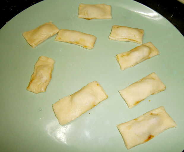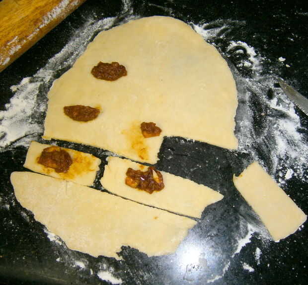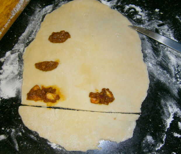 Coloque una pequeña porción de la manzana de relleno en la mitad longitudinalmente.