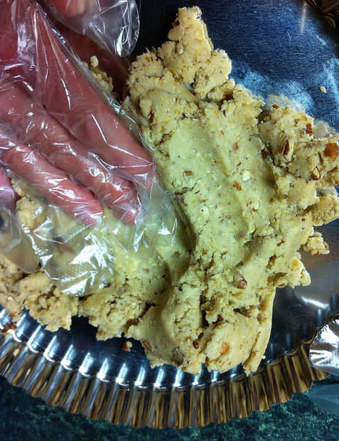 Usando ligeramente con mantequilla las manos, o guantes de plástico con un poco
