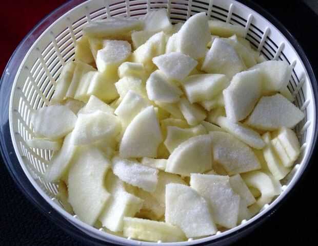 Combine las manzanas, 1 taza de azúcar y sal en el colador sobre un recipiente grande. Que sentarse, sacudiendo de vez en cuando, hasta que la manzana suelte sus jugos, unos 30 minutos. Presione suavemente en las manzanas para extraer el líquido y reserva 3/4 taza de jugo.