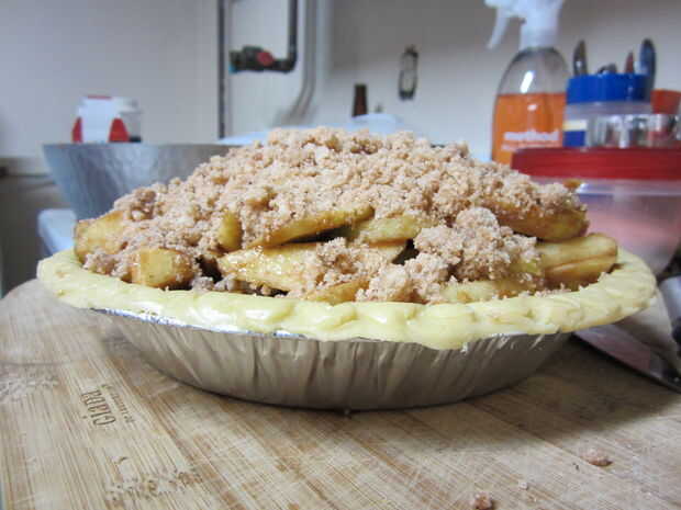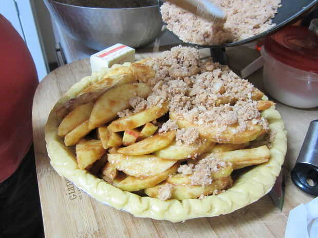 Este estilo de pastel se refiere comúnmente como "Tarta de manzana holandesa." Esto elimina la necesidad de una costra superior. También es delicioso.