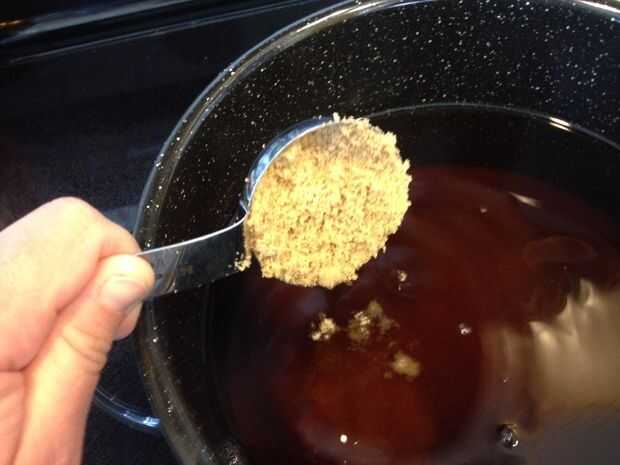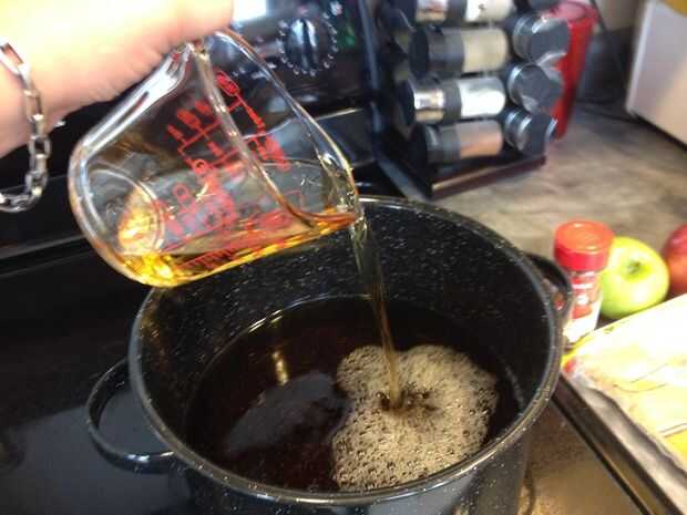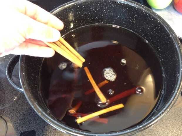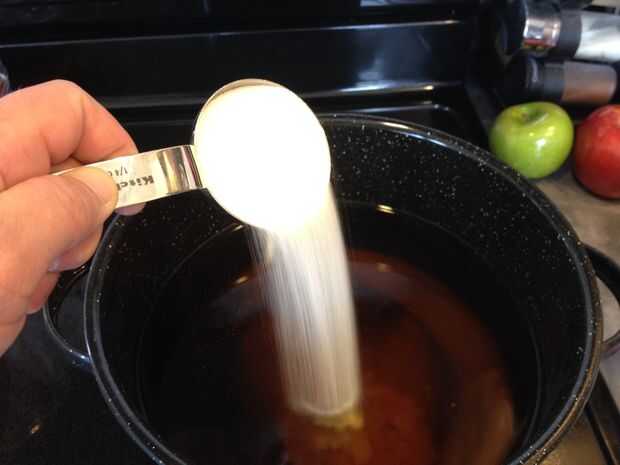 Añadir el zumo de manzana, sidra de manzana, azúcar blanco, azúcar moreno, canela se pega...  Revolver y hervir.